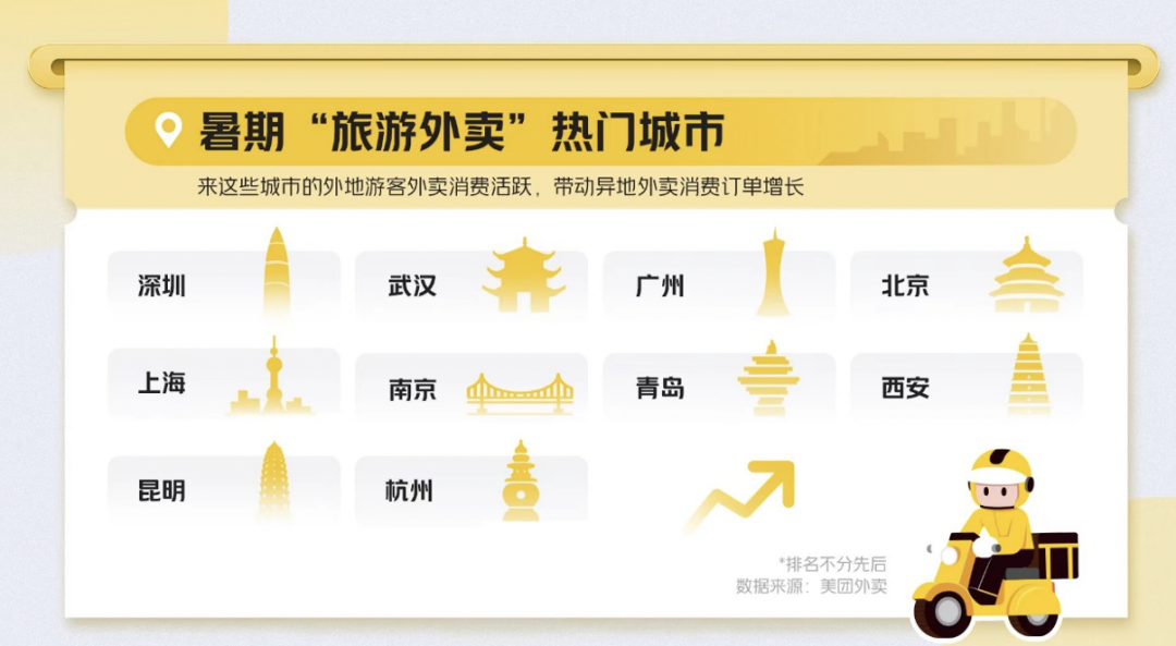 时下进入暑期旅游旺季,全国热门旅游目的地,除了线下的“烟火气”,“旅游迁徙”也激活线上消费。在热门旅游目的地城市,外地游客的外卖订单也随之增长。8月5日,美团外卖数据显示,7月下旬以来,因为外地游客的涌入,外卖“异地订单”消费热门城市就包括深圳、杭州、武汉、广州、北京、上海、南京、青岛、西安、昆明等地。线下打卡品尝特色餐馆,线上点外卖解锁更多当地特色美食,成为年轻人“美食之旅”的标配方式。