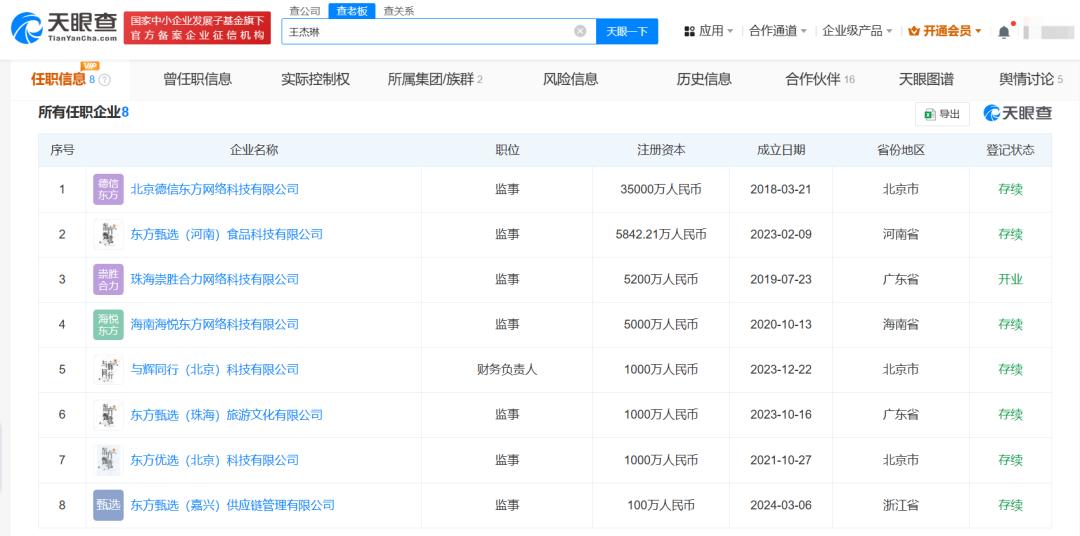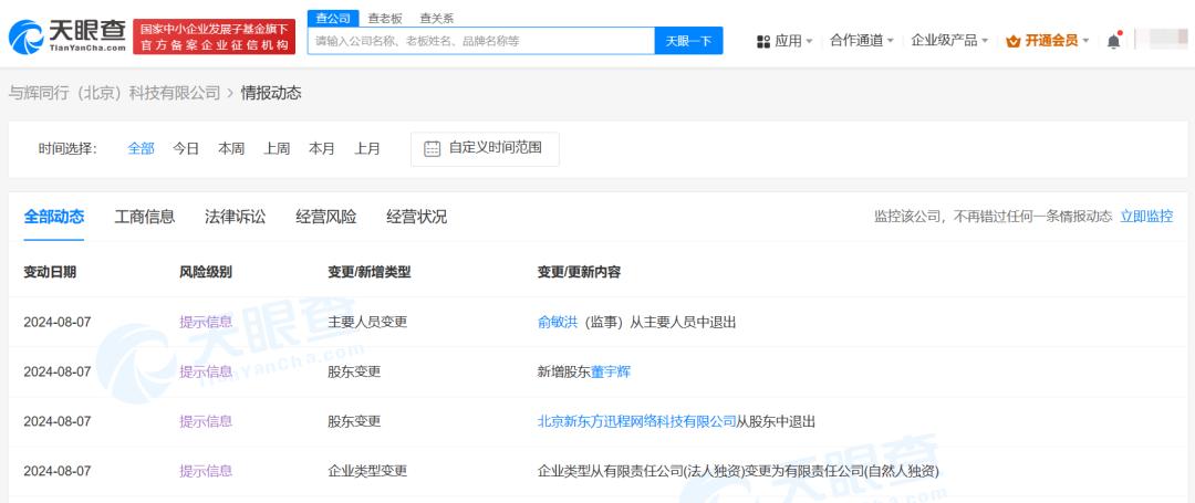 8月7日,天眼查App显示,近日,与辉同行(北京)科技有限公司发生工商变更,原全资股东北京新东方迅程网络科技有限公司退出,新增董宇辉为股东并全资持股。同时,新东方创始人俞敏洪卸任该公司监事。不过,该公司财务负责人王杰琳并未更换。王杰琳目前仍在东方优选(北京)科技有限公司、东方甄选(珠海)旅游文化有限公司等公司担任监事。