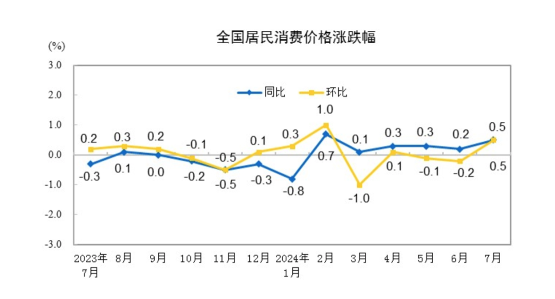 8月9日,国家统计局公布的最新物价数据显示,7月,全国居民消费价格(以下简称CPI)同比、环比均上涨0.5%,同比实现“六连涨”,创今年3月以来新高;全国工业生产者出厂价格(以下简称PPI)同比下降0.8%,环比下降0.2%,降幅均与上月相同。