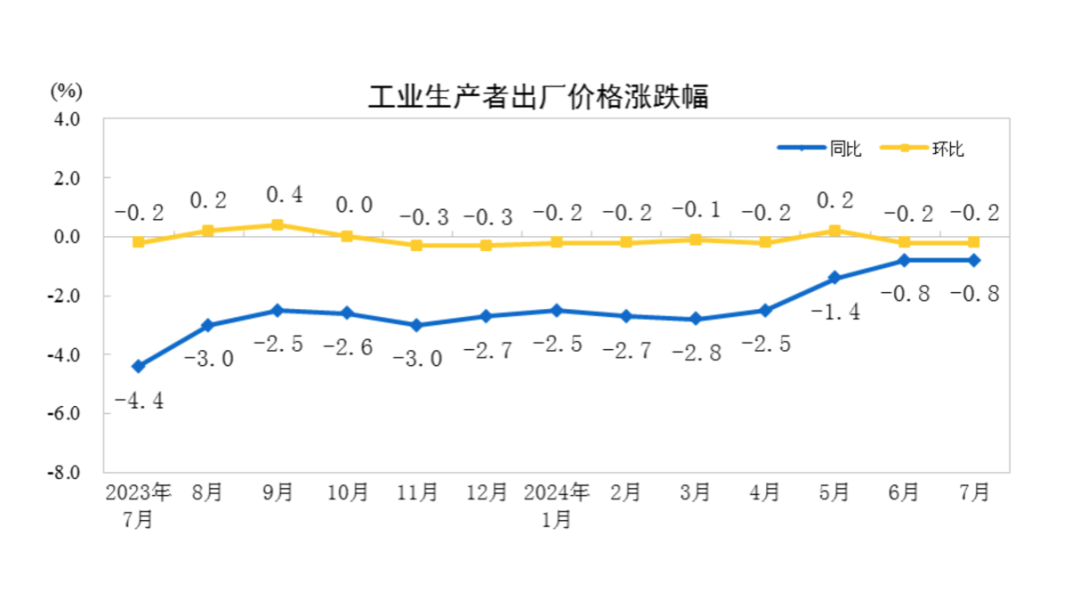 数据显示,7月份,PPI同比下降0.8%,环比下降0.2%,降幅均与上月相同。董丽娟解读认为,7月份,受市场需求不足及部分国际大宗商品价格下行等因素影响,全国PPI环比、同比降幅均与上月相同。