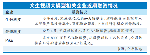 但记者注意到,在AI视频生成领域“赛道”,无论是海外,还是国内的一些初创明星企业都吸引资金青睐。据悉,今年6月,生数科技完成数亿元Pre-A轮融资,该轮融资由北京市人工智能产业投资基金、百度联合领投,中关村科学城公司等跟投,启明创投等数位老股东继续支持。今年4月,视频大模型领域创业公司爱诗科技完成超亿元人民币A2轮融资,蚂蚁集团领投。