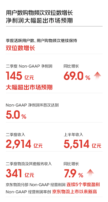 二季度,物流及其他服务收入达到341亿元,同比增长7.9%。截至二季度,京东物流分部的非美国通用会计准则下经营利润已连续5个季度实现盈利,二季度非美国通用会计准则下的经营利润率创京东物流上市以来新高。
