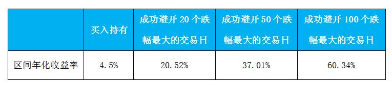 在完美的理想状态下,若次次都能精准择时,理论收益将是巨大的。从沪深300指数2013至2022年,完整10年、2431个交易日来看,累计收益率为53.5%(年化收益率4.5%)。假设能参与全部上涨交易日并成功避开跌幅最大的20个、50个、100个交易日,相对“买入持有”可展现出十分惊人的“超额”收益(见下表),这也是吸引不少“自信”的投资者进行频繁择时进出的原因。