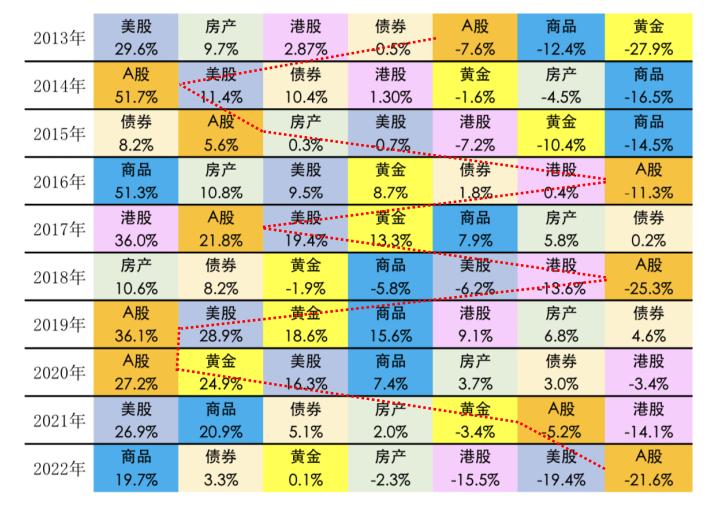 我们选取股票、债券、商品、黄金、房产以及境外股票标的(港股、美股)这几类风险收益特征各有不同、相关性较低的代表性资产进行观察,可以发现,过去10年间:一是在收益率的竞逐中没有“常胜将军”;二是同一资产在年度间的收益差距也很大(尤其是高风险资产),相对强弱也起伏明显,收益、排名的“反转”剧情不断上演,且难有规律可循。(见下图)