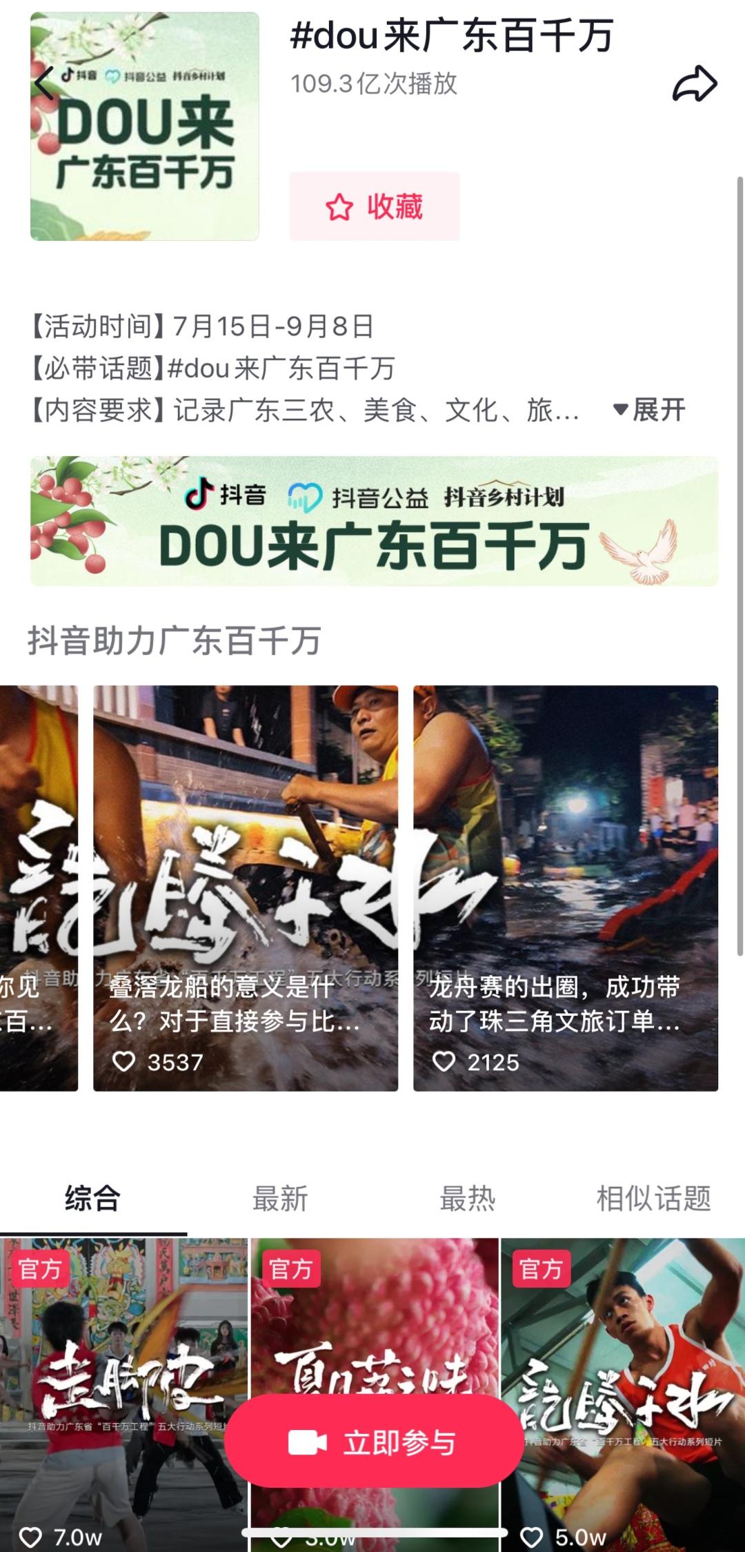 此外,抖音积极组织站内创作者传播广东特色文化,推进乡村形象提升行动。截至目前,项目专属话题“粤品月香”“广东DOU是好风光”“DOU来广东百千万”已总计实现广东相关内容传播145.3亿次。