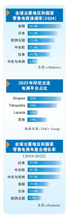 商业数据平台Statista发布的数据显示,在全球电商销售额增速最快的前10个国家中,来自东南亚、拉美等区域的国家承包了7个席位,凸显出新兴市场的蓬勃生机。同时,我国领跑的视频带货、直播带货、低价团购等新型电商形态,为当地电商的进一步发展打下基础。