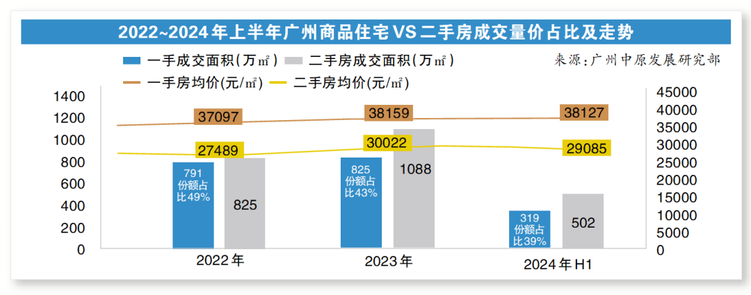 这一进程将对一二手市场产生不同的影响。一方面,随着二手市场挂牌量的上升,“以价换量”行情延续。以广州为例,克而瑞数据监测显示,2024年1~7月广州二手房成交60232套的同时成交均价加速回调,从去年的3万余元,降至今年的2字头。其中,大面积改善产品议价幅度居前,90平方米小面积成交占近7成,显示出刚需刚改群体对于二手市场的主导作用。合富研究院分析指出,在买方市场格局之下,广州二手楼市复苏行情仍较大程度依赖于降价盘成交。