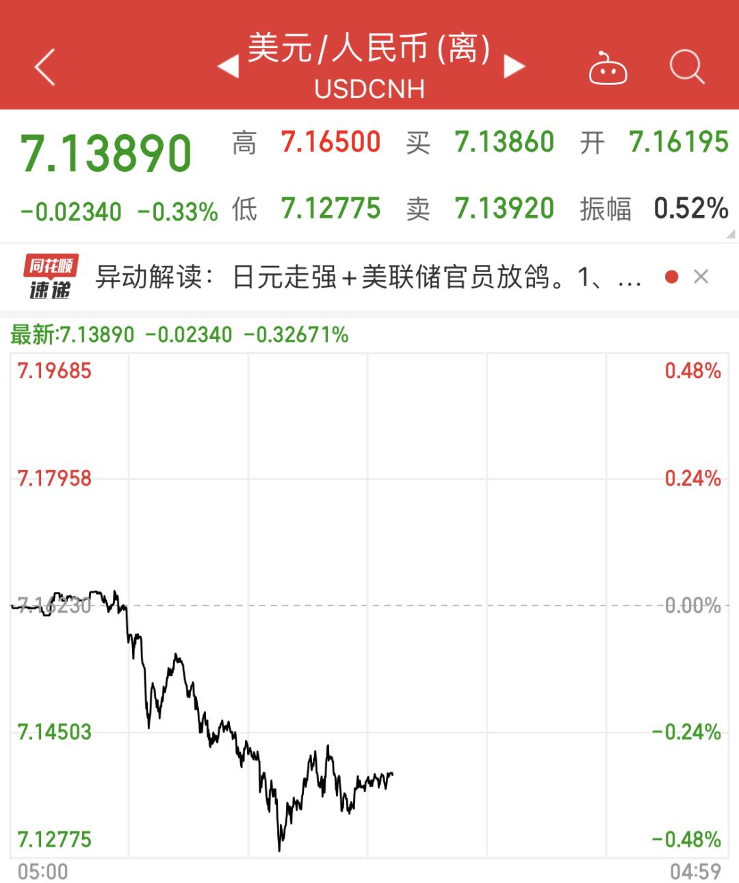 8月19日,在岸和离岸人民币对美元汇率大幅上涨,盘中均涨超300基点。其中,在岸人民币对美元汇率盘中一度涨至7.1314,更多反映国际投资者预期的离岸人民币对美元盘中一度收复7.13关口,涨至7.12775。