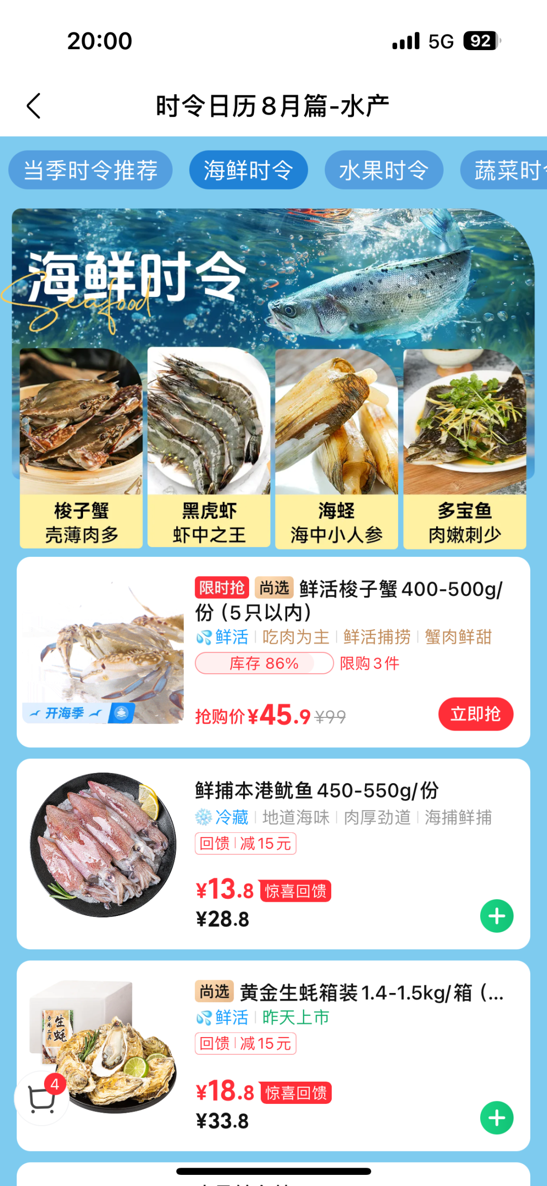 除此之外,记者登录朴朴App看到,在海鲜水产栏目下,上线了“当季时令推荐”活动,其中海鲜类推荐梭子蟹、黑虎虾、海蛏以及多宝鱼等,截至记者发稿,页面显示,鲜活梭子蟹400g-500g/份(5只以内),抢购价45.9元。
