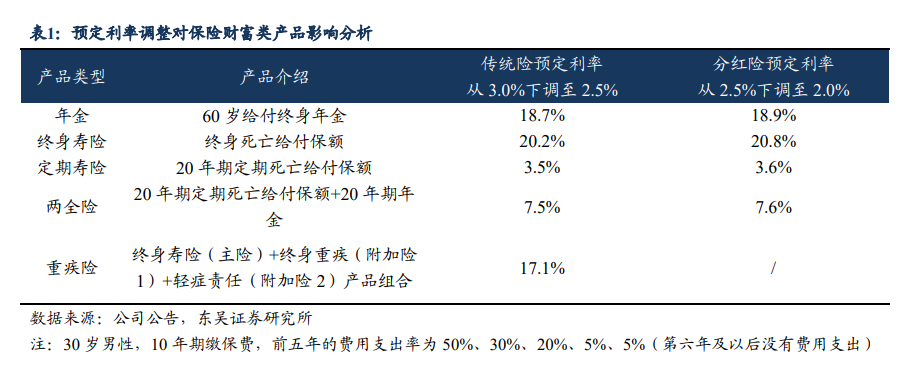 “本次预定利率降幅在50bps,分红险(预定利率由2.5%下调至2.0%)比传统险(预定利率由3.0%下调至2.5%)毛保费敏感度更大。”东吴证券最新研报显示,当传统险预定利率从3.0%下调到2.5%,预定利率越低,毛保费上涨幅度越大。短期险和保障功能更强的长期险产品对于利率敏感度相对不高。而本次建立长效动态定价机制,则有助于寿险公司从源头提升资产负债管理能力。
