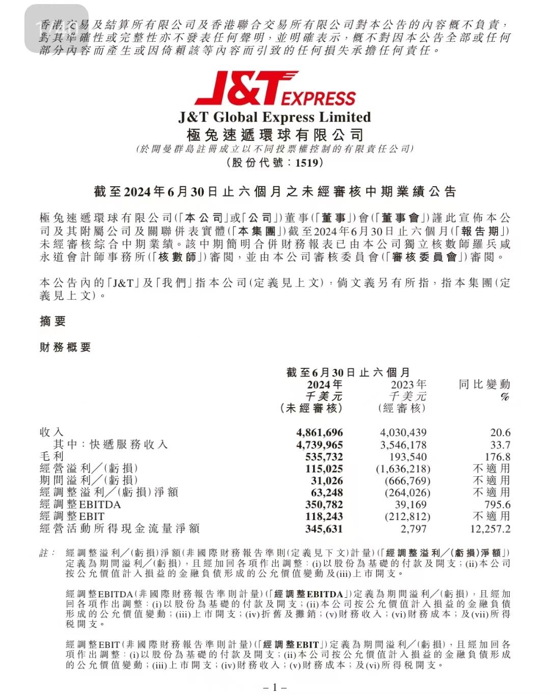 8月19日,极兔速递公布2024年中期业绩。上半年极兔速递收入达到48.6亿美元,按年增长20.6%。其中,核心业务快递服务收入为47.4亿美元,按年增长33.7%。上半年毛利为5.4亿美元,按年升176.8%。上半年公司所有盈利指标均为正数,净利润扭亏转盈,录得盈利3,102.6万美元,去年同期亏损6.7亿美元;经调整净盈利为6,324.8万美元,去年同期亏损2.6亿美元。
