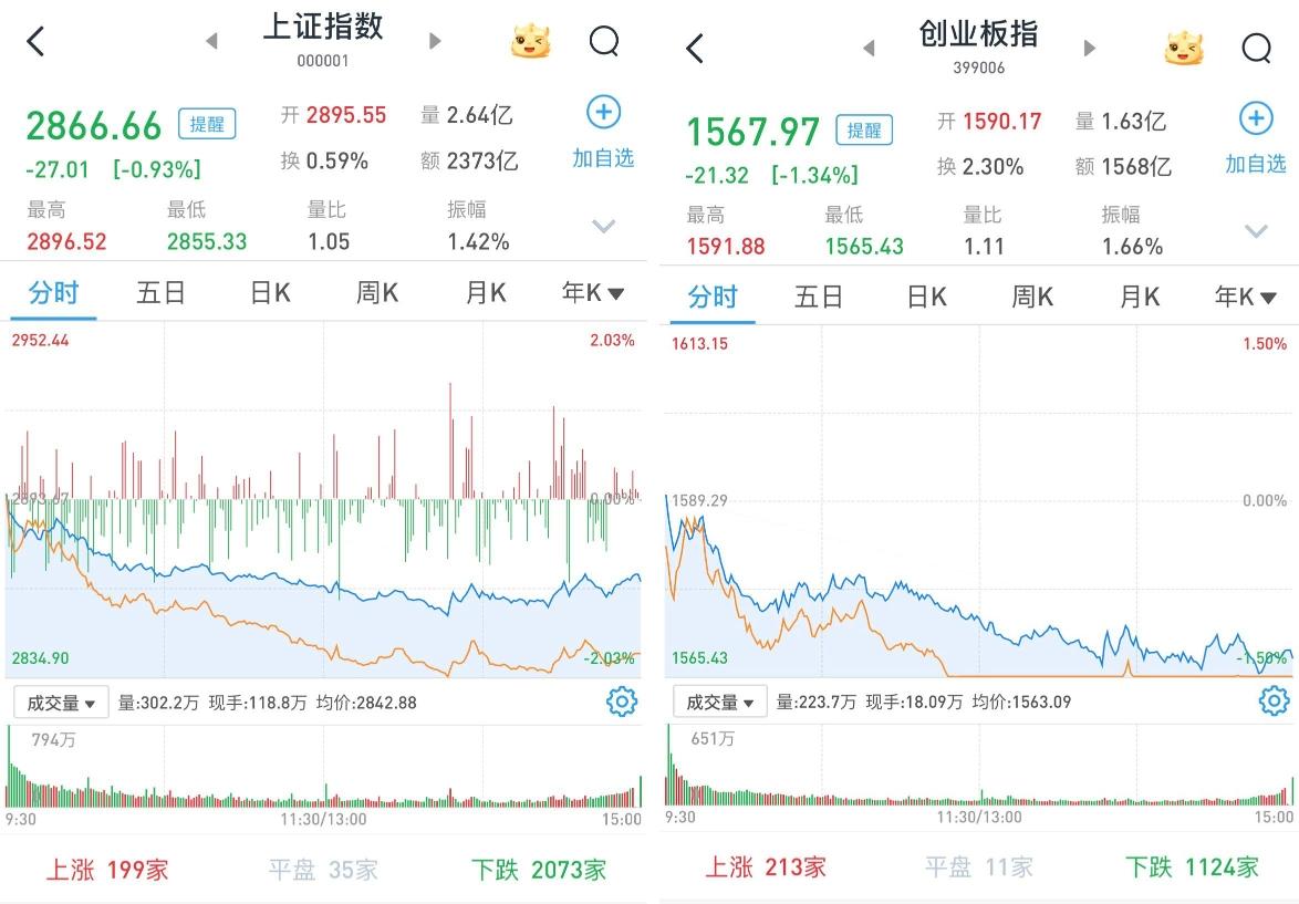 至收盘,上证综指跌0.93%,报2866.66点;科创50指数跌1.39%,报693.52点;深证成指跌1.24%,报8252.87点;创业板指跌1.34%,报1567.97点。