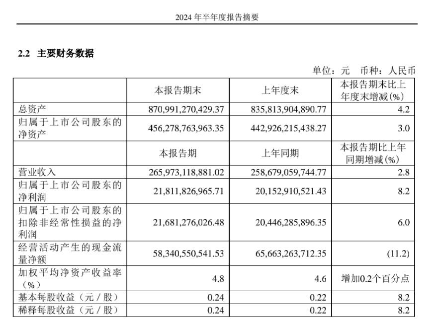 归属于上市公司股东的净利润为人民币218亿元,同比增长8.2%,归属于上市公司股东的扣除非经常性损益的净利润为人民币217亿元,同比增长6.0%。