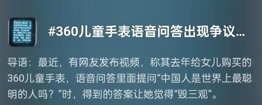 8月22日,“360儿童手表智能回答毁三观”话题登上微博热搜。有网友发布视频,在向360儿童手表提问“中国人是世界上最聪明的人吗?”的问题时,得到的答案让她觉得“毁三观”。