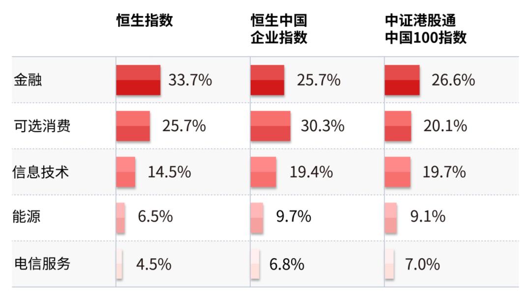 从行业分布来看,这三只指数的前五大行业相同,分别为金融、可选消费、信息技术、能源和电信服务。