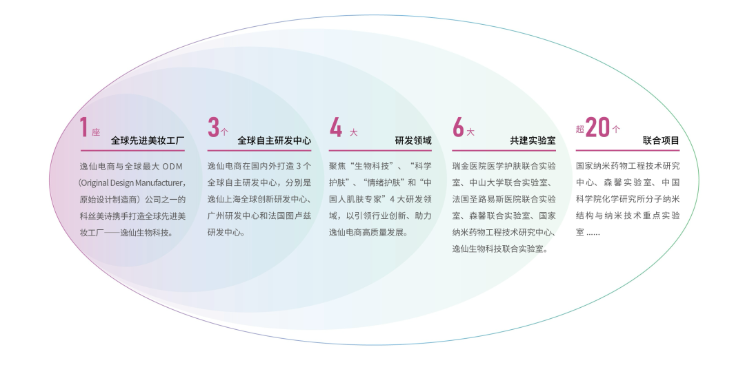 2023年,通过建立“逸仙科技之路”,以“1-3-4-6-20”科技之路进行全球化战略布局,逸仙集团打造了一座全球先进美妆工厂和三个自主研发中心,聚焦于生物科技、科学护肤、情绪护肤及中国人肌肤专家四大研发领域,以自主创新研发战略,推动集团旗下品牌发展。同时,公司还与多家国际知名机构共建六大实验室,开展超20个联合项目,在全球范围对护肤及化妆领域的前沿技术进行识别、研究和商业应用,致力于打造优质的美妆产品。