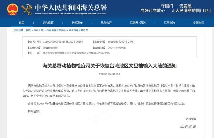 各海关自2024年9月2日起恢复受理台湾地区文旦柚报关,并依法依规实施检验检疫。同时,请及时将上述情况通知辖区内相关企业。