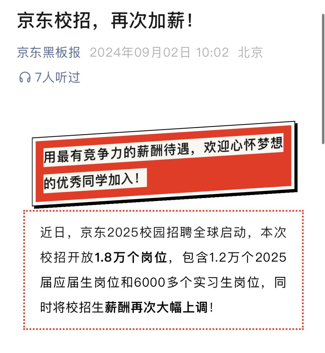 9月2日,“京东黑板报”公众号消息,近日,京东2025校园招聘全球启动,本次校招开放1.8万个岗位,包含1.2万个2025届应届生岗位和6000多个实习生岗位。