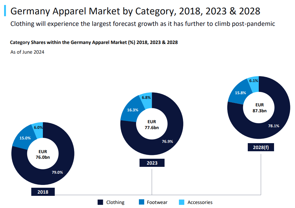 根据GlobalData 《2028年德国服装市场》报告,德国时尚市场继续增长,已经在2023年恢复到疫情前水平,鞋类和配饰的销售额分别增长了 11.5% 和 16.2%。预计该国服装市场2023年至2028年期间继续录得强劲增长,销售额预计将增长14.2%至 682 亿欧元(760.4 亿美元)。