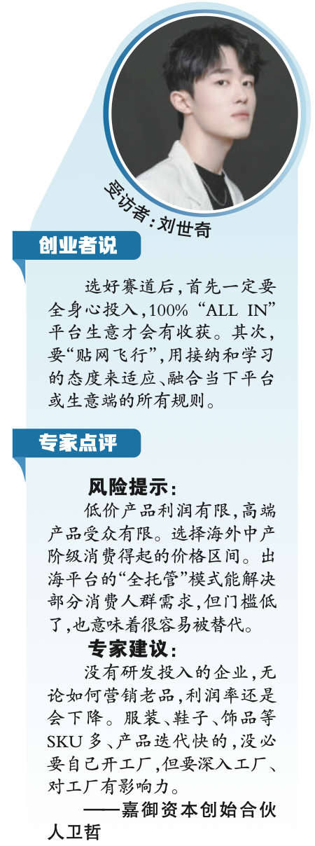 2021年,刘世奇在福建泉州鞋城附近的跨境电商园区租了一个屋子,一个人带着一只猫,开始了创业之路。在3个月的自行学习和做大量调研后,同年6月,他在阿里国际上开通了第一个店铺,摸索着上架商品,做店铺的装修,做最基础的一些基建。