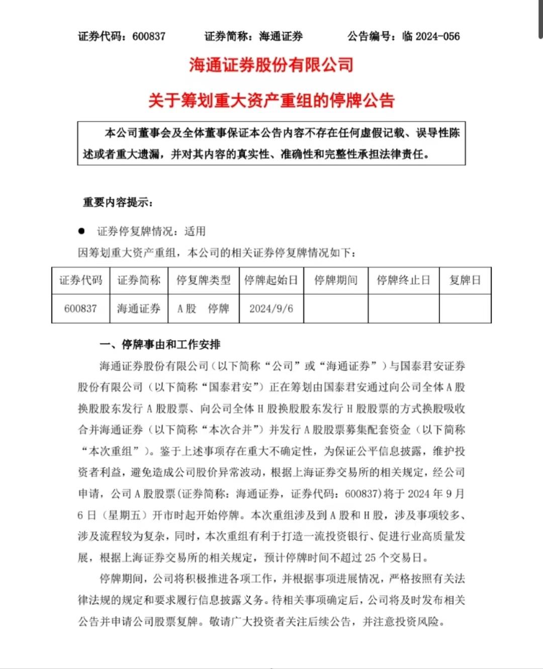鉴于上述事项存在重大不确定性,为保证公平信息披露,维护投资者利益,避免造成股价异常波动,根据上海证券交易所的相关规定,经申请,国泰君安、海通证券A股股票将于2024年9月6日(星期五)开市时起开始停牌。公告称,本次重组涉及A股和H股,涉及事项较多、涉及流程较为复杂,同时,本次重组有利于打造一流投资银行、促进行业高质量发展,根据上海证券交易所的相关规定,预计停牌时间不超过25个交易日。