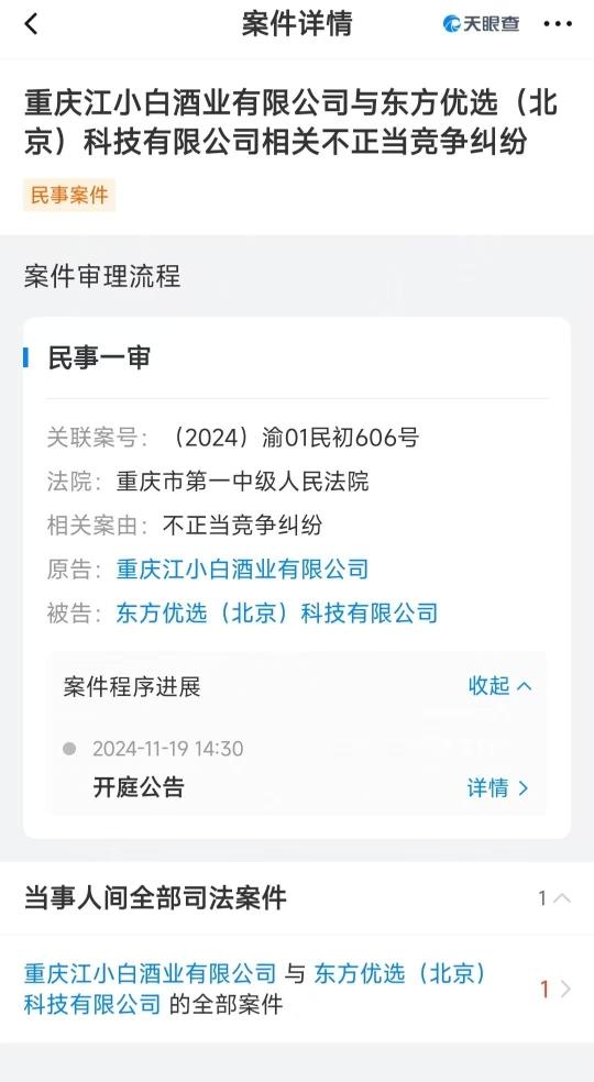 9月12日,据天眼查法律诉讼信息显示,近日,重庆江小白酒业有限公司与东方甄选关联公司东方优选(北京)科技有限公司相关不正当竞争纠纷案件新增开庭公告,原告为重庆江小白酒业有限公司,该案将于11月19日在重庆市第一中级人民法院开庭审理。