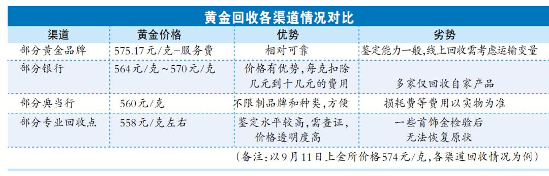 当前,一些商场黄金柜台和黄金门店可以提供黄金回收服务,但具体的回收规则因品牌而异。据介绍,一些商场的实物黄金回收价参照当天的上海金交所基础金价动态制定,大约每一克减数元至十余元不等。以中国黄金的线上实物黄金回收业务为例,成交价格由该公司参照上海黄金交易所Au99.99现货合约的实时金价进行设定,记者登录平台注意到,9月11日该平台服务费为:中国黄金品牌3元/克,其他品牌10元/克。