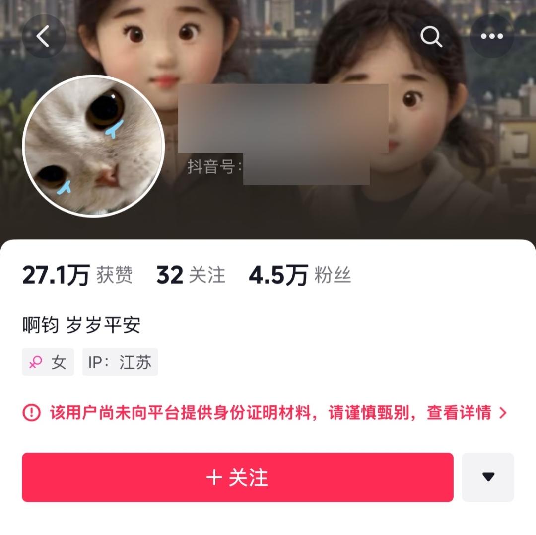那这个账号的主人是“碎花裙小姐姐”本人吗?记者在该账号的抖音主页看到,平台作了标注:该用户尚未向平台提供身份证明材料,请谨慎甄别。