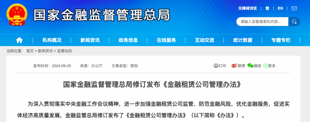 9月20日,金融监管总局官网显示,为进一步加强金融租赁公司监管,防范金融风险,优化金融服务,促进实体经济高质量发展,金融监管总局修订发布了《金融租赁公司管理办法》(以下简称《办法》)。