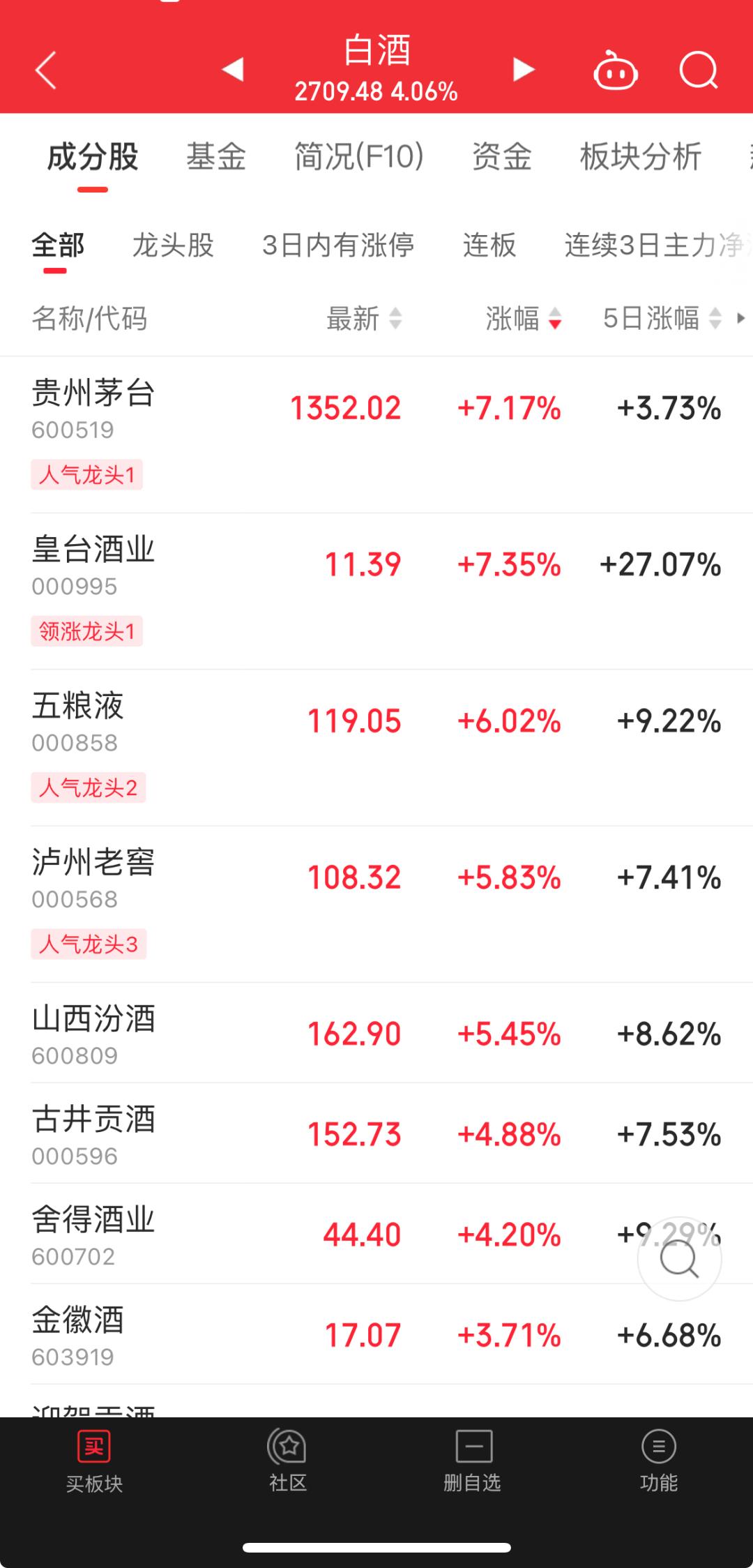 9月24日,白酒股午后拉升,A股所有白酒股上涨。贵州茅台涨超7%,五粮液涨超6%,泸州老窖、山西汾酒等涨超5%,其他白酒股跟涨。