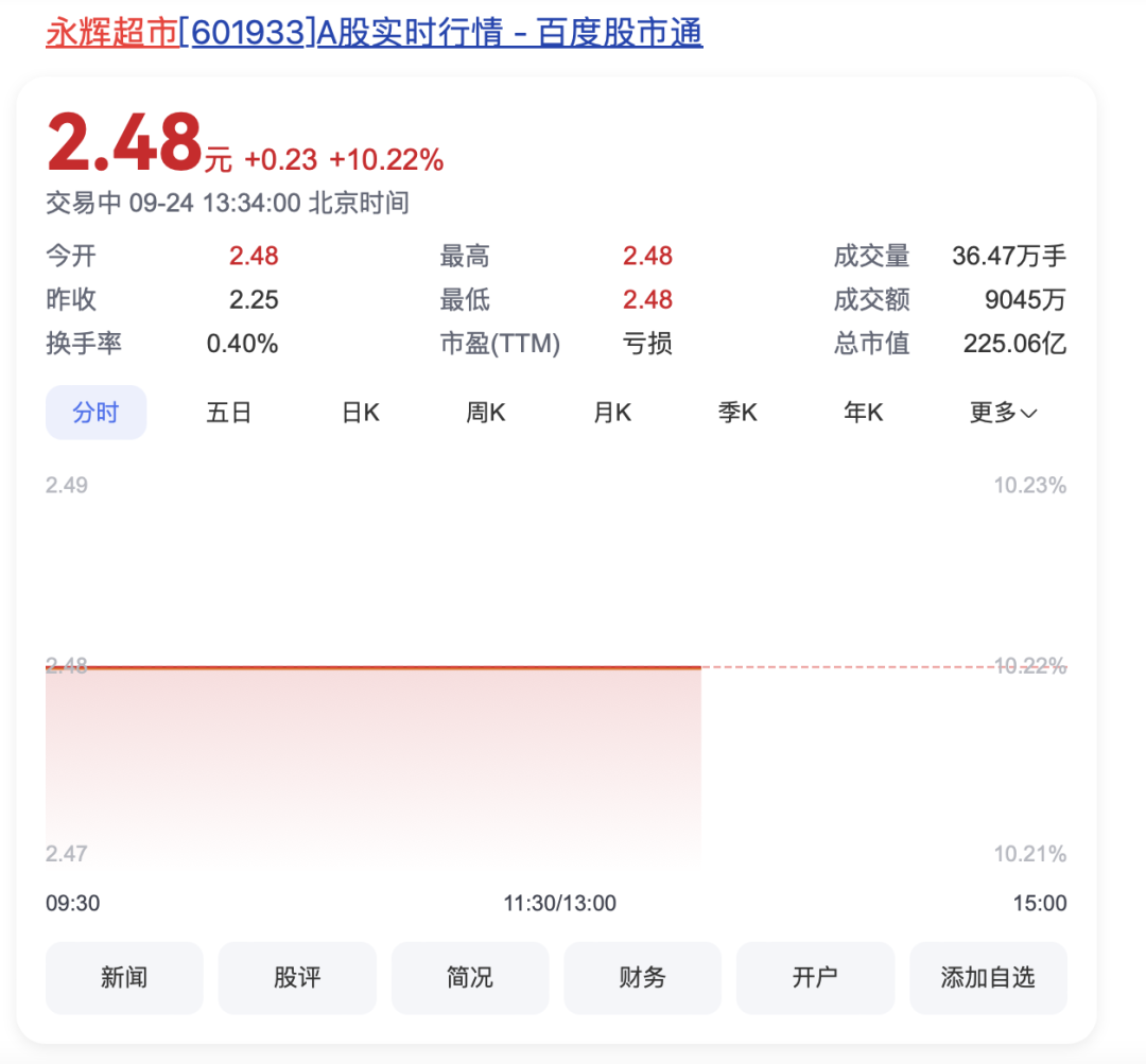 截至9月24日午间收盘,名创优品港股股价跌26.14%,报24.30港元/股。永辉超市A股涨停,股价报2.48元/股。当日午后开盘,永辉超市股价继续涨停,名创优品港股跌幅稍有收窄。