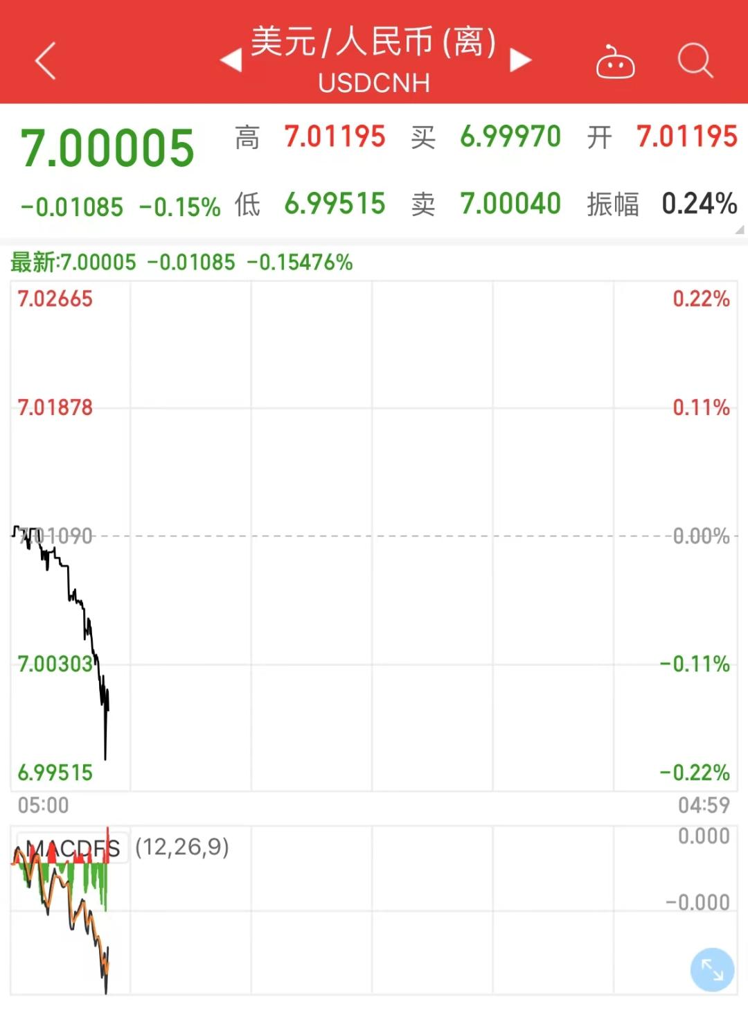 9月25日,人民币对美元汇率继续升值走高,更多反映国际投资者预期的离岸人民币对美元汇率盘中一度升值突破7.0关口,最高触及6.99515,为去年5月以来首次,创16个月以来的新高。
