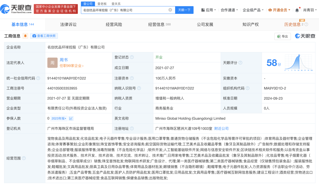 该公司成立于2021年7月,法定代表人为周书,经营范围含普通货物仓储服务、企业管理咨询、企业形象策划、安全咨询服务、航空国际货物运输代理、数据处理和存储支持服务、企业总部管理等,由名创优品(广州)有限责任公司全资持股。