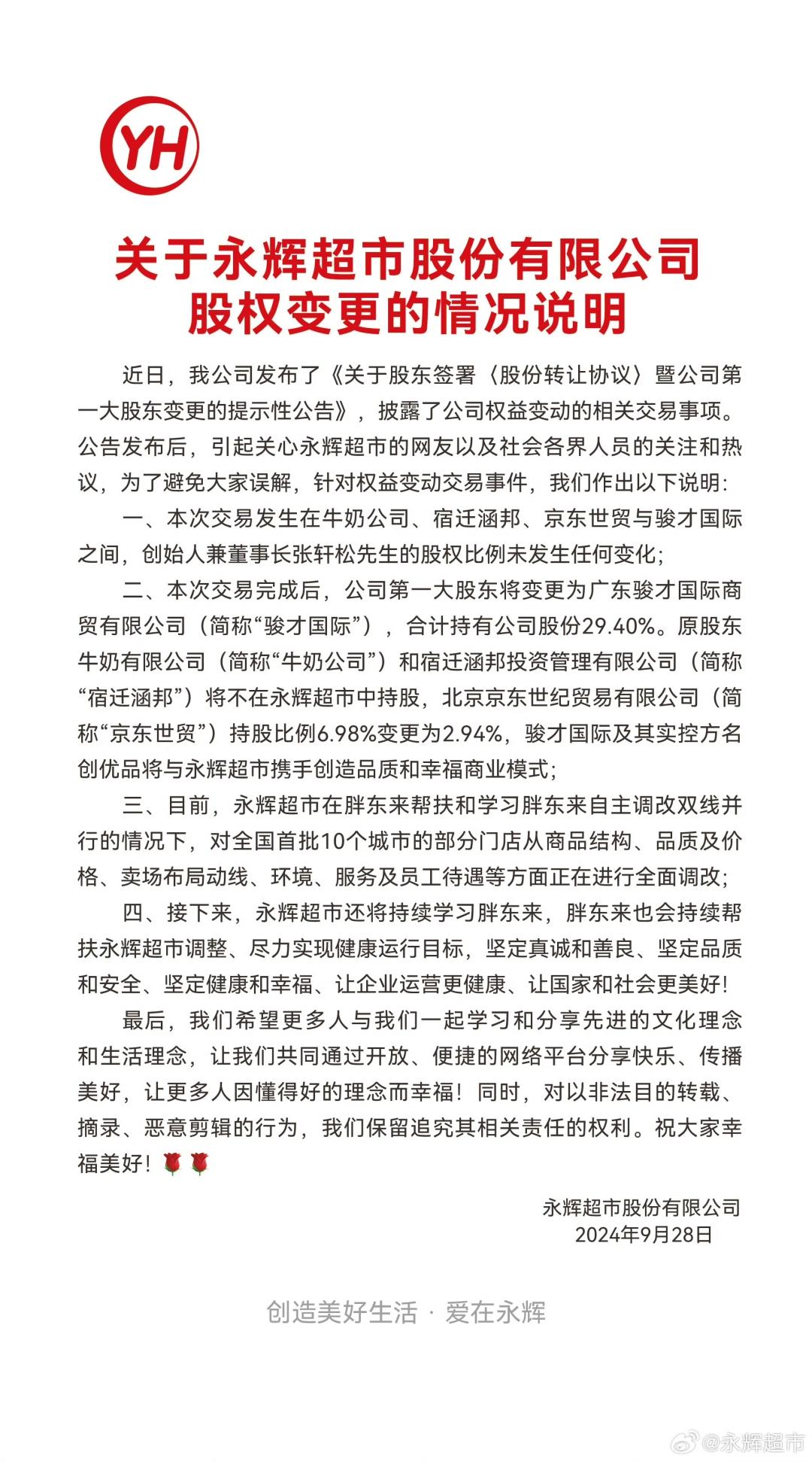 名创优品收购永辉超市股权事件仍在发酵。9月29日,永辉超市官方微博发布关于股权变更的情况说明(以下简称:说明)。说明表示,近日,公司发布了《关于股东签署〈股份转让协议〉暨公司第一大股东变更的提示性公告》,披露了公司权益变动的相关交易事项。公告发布后,引起关心永辉超市的网友以及社会各界人员的关注和热议,为了避免误解,针对权益变动交易事件,永辉超市表示,创始人兼董事长张轩松的股权比例未发生任何变化,永辉超市还将持续学习胖东来,胖东来也会持续帮扶永辉超市调整、尽力实现健康运行目标。
