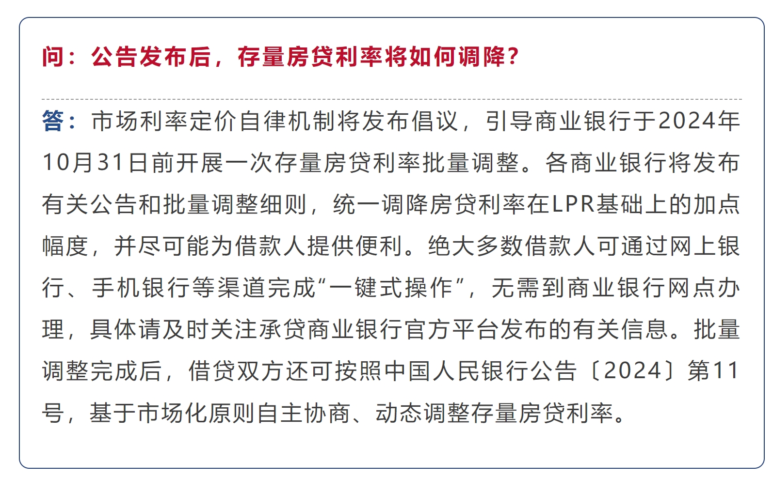 答:各商业银行将发布有关公告和批量调整细则,统一调降房贷利率在LPR基础上的加点幅度,并尽可能为借款人提供便利。绝大多数借款人可通过网上银行、手机银行等渠道完成“一键式操作”,无需到商业银行网点办理,具体请及时关注承贷商业银行官方平台发布的有关信息。