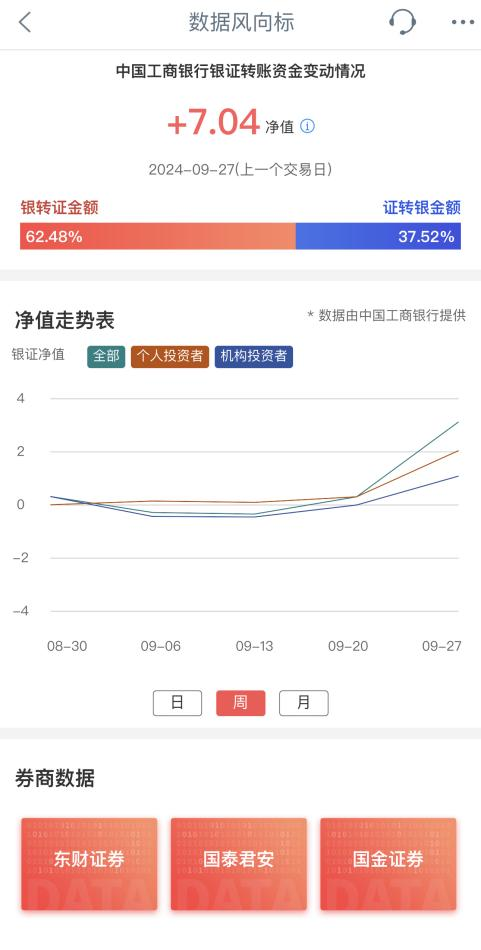 9月30日,工商银行手机App显示,9月27日(上一个交易日)银证转账指数上涨至7.04,显著高于前几个交易日。9月23日至26日,银证转账指数分别为0.66、2.15、1.4、4.4。9月27日,个人投资者银证转账指数为5.2,机构投资者银证转账指数为1.84。9月23日至27日的周度银证转账指数为3.13,较前几周涨幅也较为明显。
