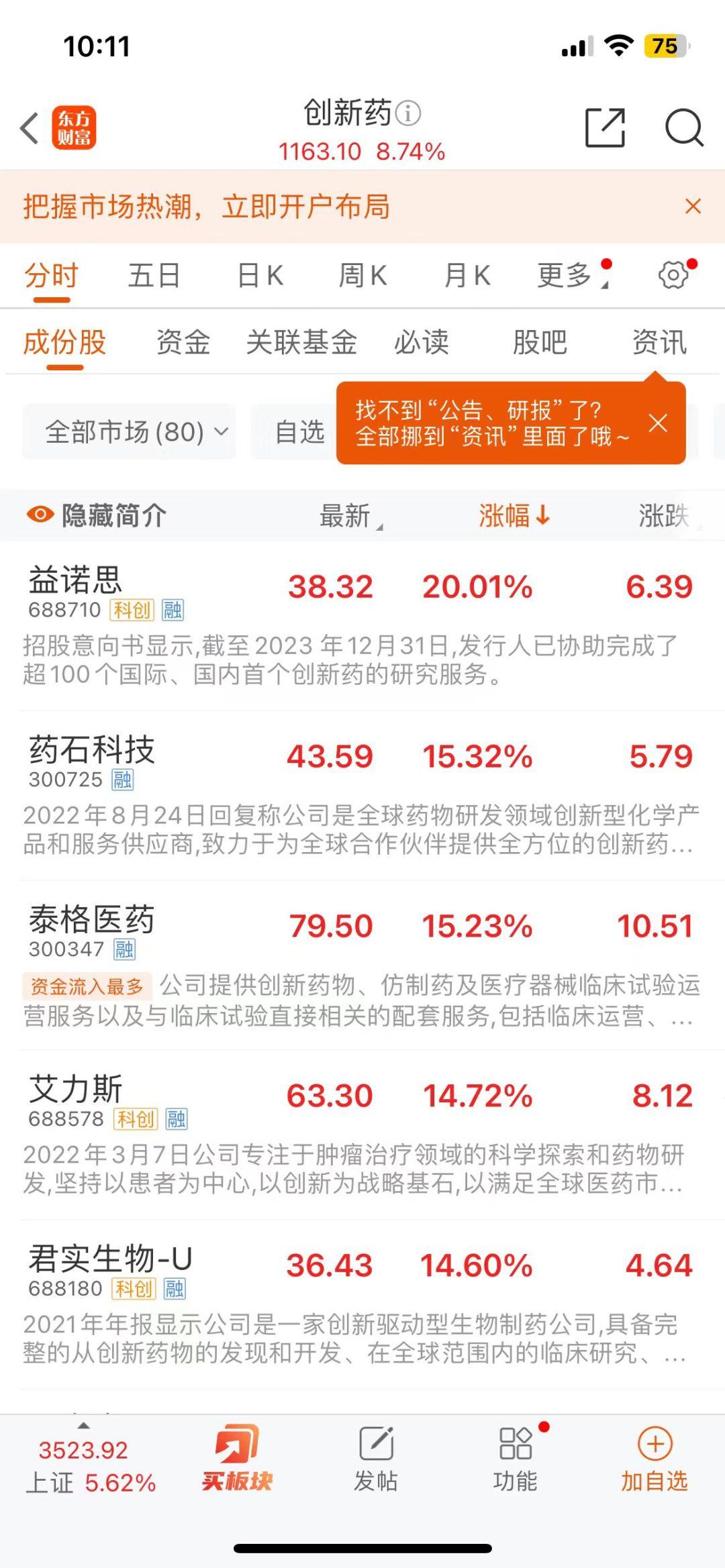 10月8日,A股三大股指大幅高开,创新药概念股集体大涨,包括泰格医药、海南海药、红日医药、振东制药等。
