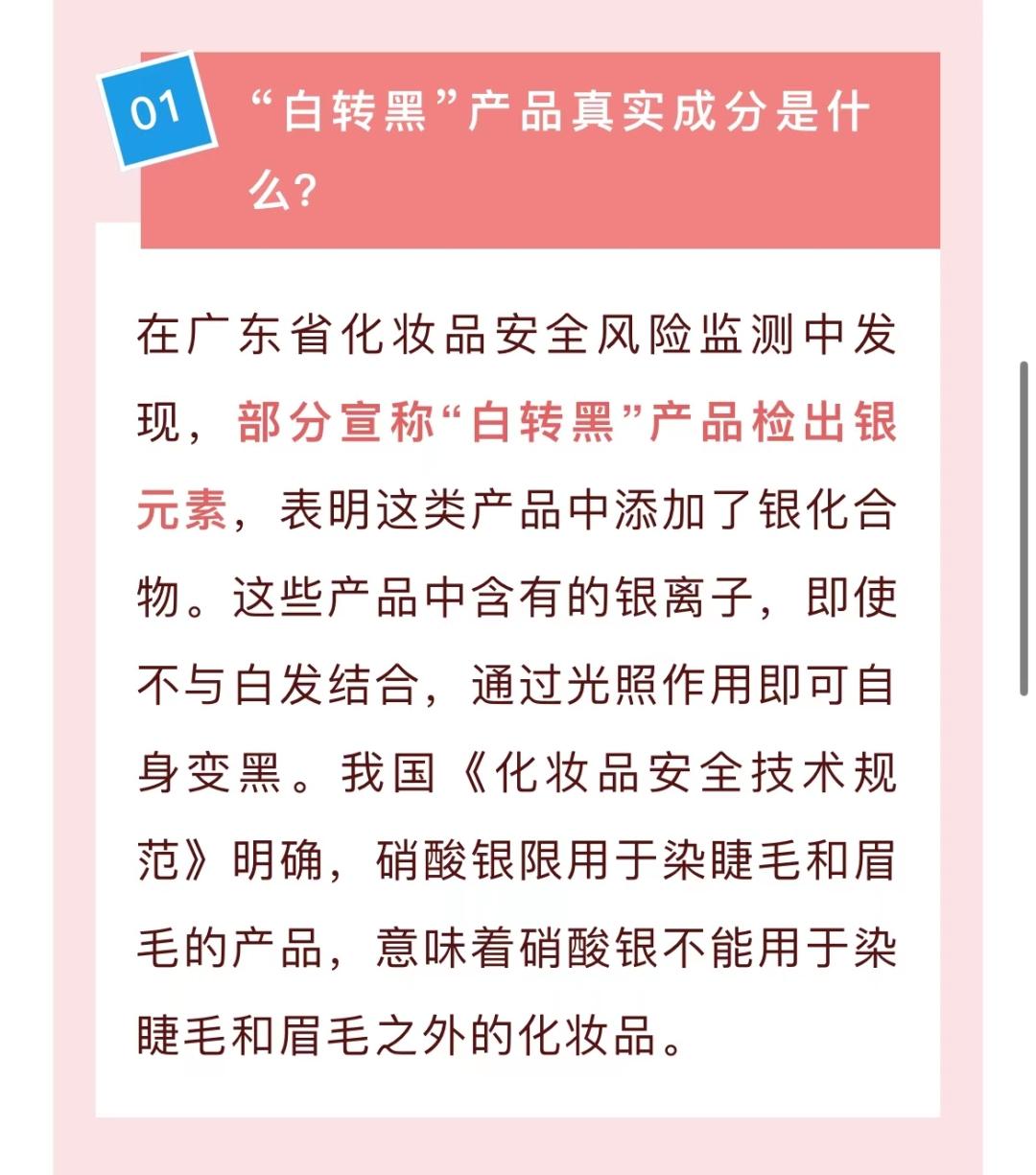 广东省药品监督管理局微信公众号“广东药监”发布消息称:近年来,一些宣称通过光照“合成天然黑色素”,或是宣称源于自然、草本萃取、无副作用能促使头发“白转黑”的发用产品,吸引了广大消费者的关注,那么这些所谓的“白转黑”产品真实有效成分究竟是什么?真的如商家宣称的那样天然吗?今年,广东省药品监督管理局对该类产品进行化妆品安全风险监测发现,部分宣称“白转黑”的产品检出银元素,表明这类产品中添加了银化合物。这些产品中含有的银离子,即使不与白发结合,通过光照作用即可自身变黑。我国《化妆品安全技术规范》明确,硝酸银限用于染睫毛和眉毛的产品,意味着硝酸银不能用于染睫毛和眉毛之外的化妆品。