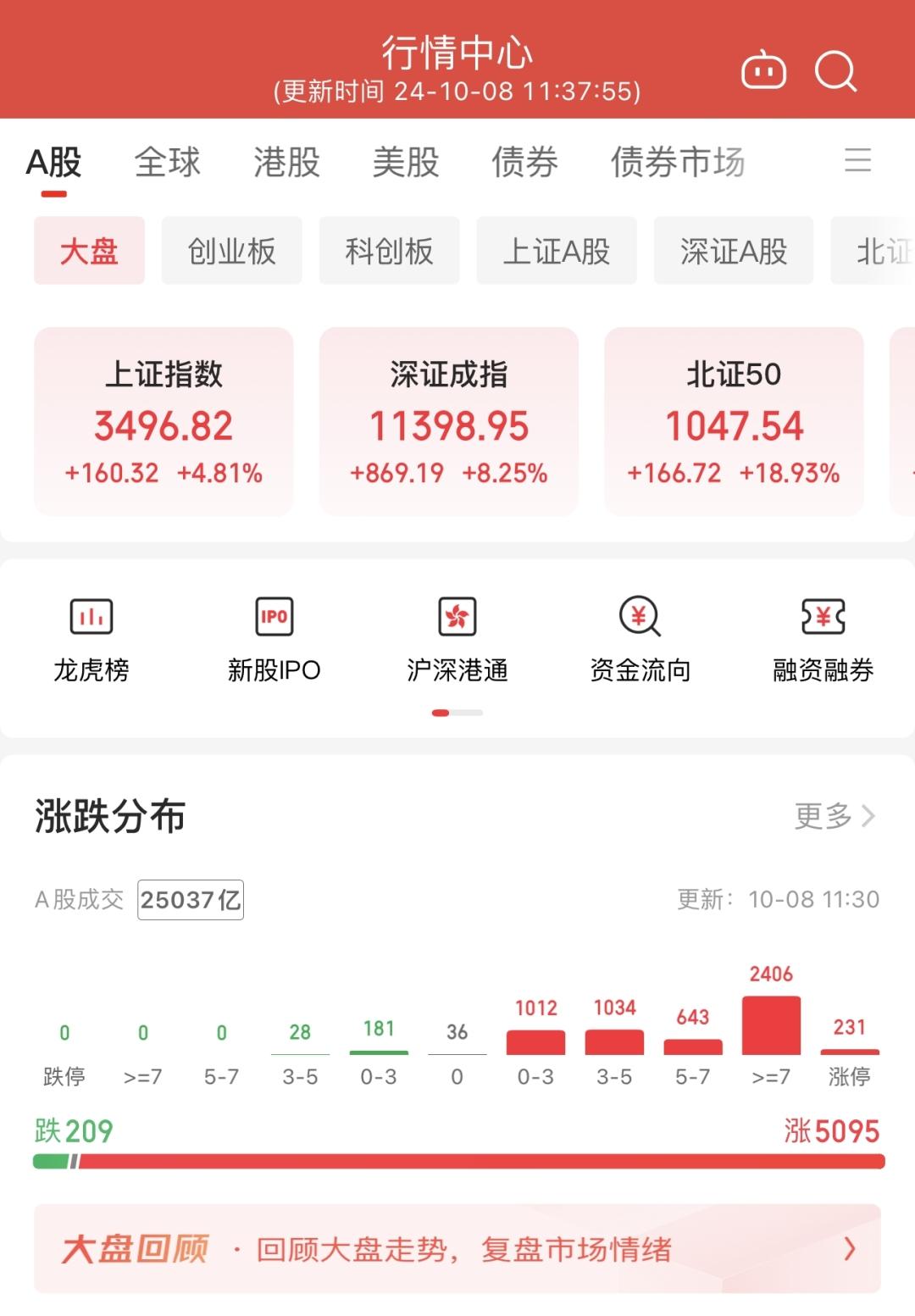 10月8日,A股早盘全市场成交额25025亿元,较上日放量8326亿元,再次刷新纪录!当天A股大幅高开,回落后再度走高。截至早盘收盘,上证指数涨4.81%,深证成指涨8.25%,创业板指涨14.26%,北证50指数涨18.93%。两市超5000只个股上涨。