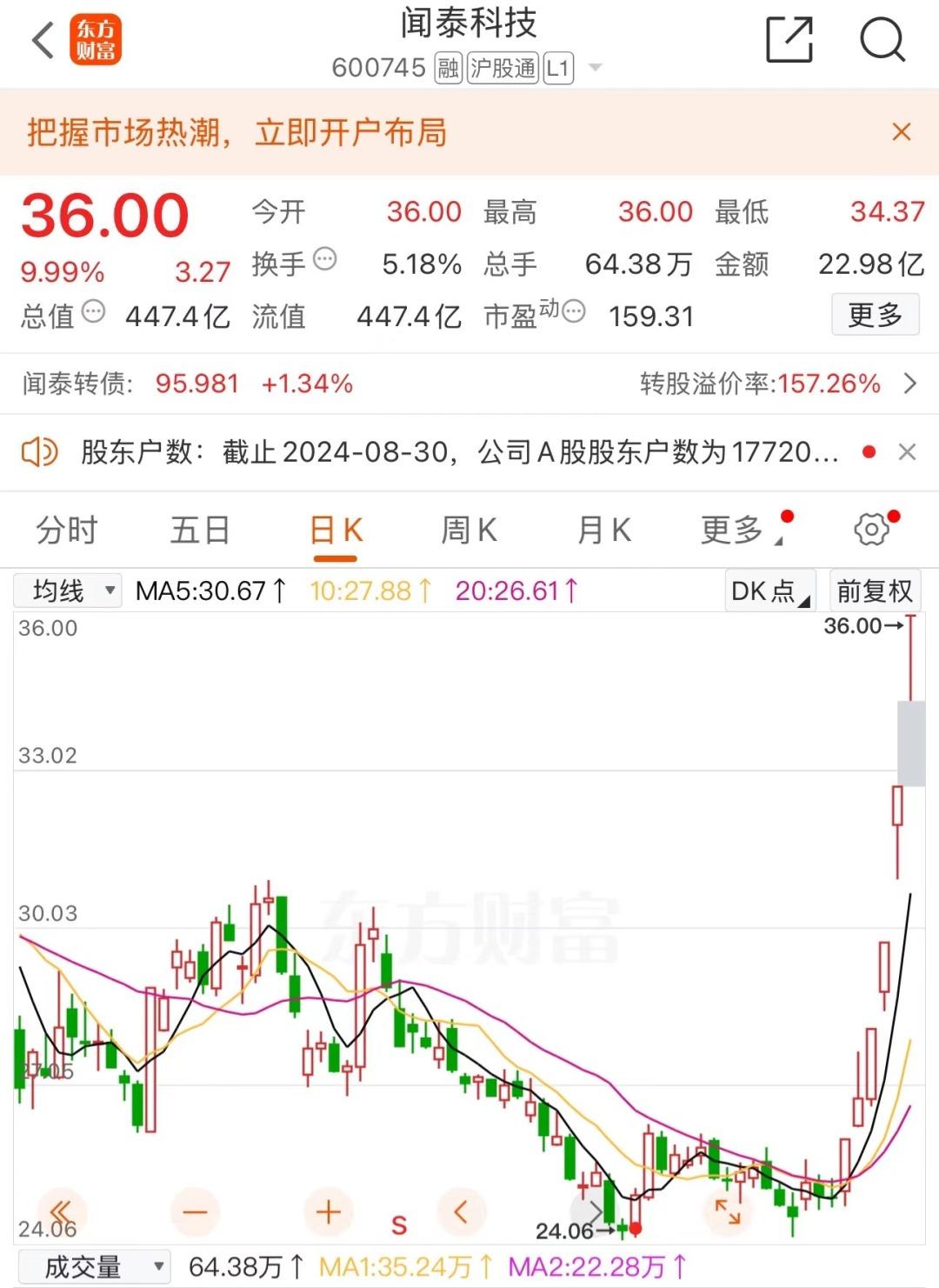 截至10月8日收盘,闻泰科技报36元/股,上涨9.99%。其股价从9月23日的24.85元/股向上反弹约45%。