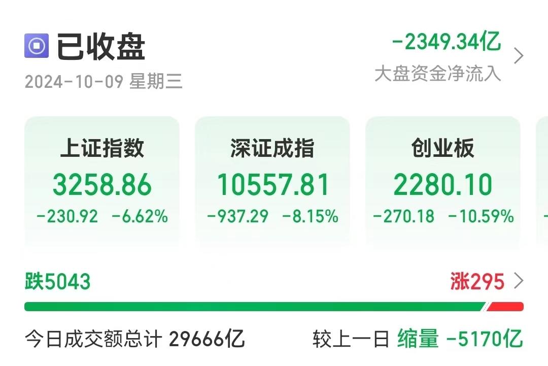 截至收盘,上证指数跌6.62%报3258.86点,深证成指跌8.15%报10557.81点,创业板指跌10.59%报2280.10点,北证50跌12.11%,科创50跌2.55%。全天不足300股飘红,超840股跌停。全日市场成交额29398亿元,较上一日少5121亿元。机构表示,市场随时可能震荡和调整。