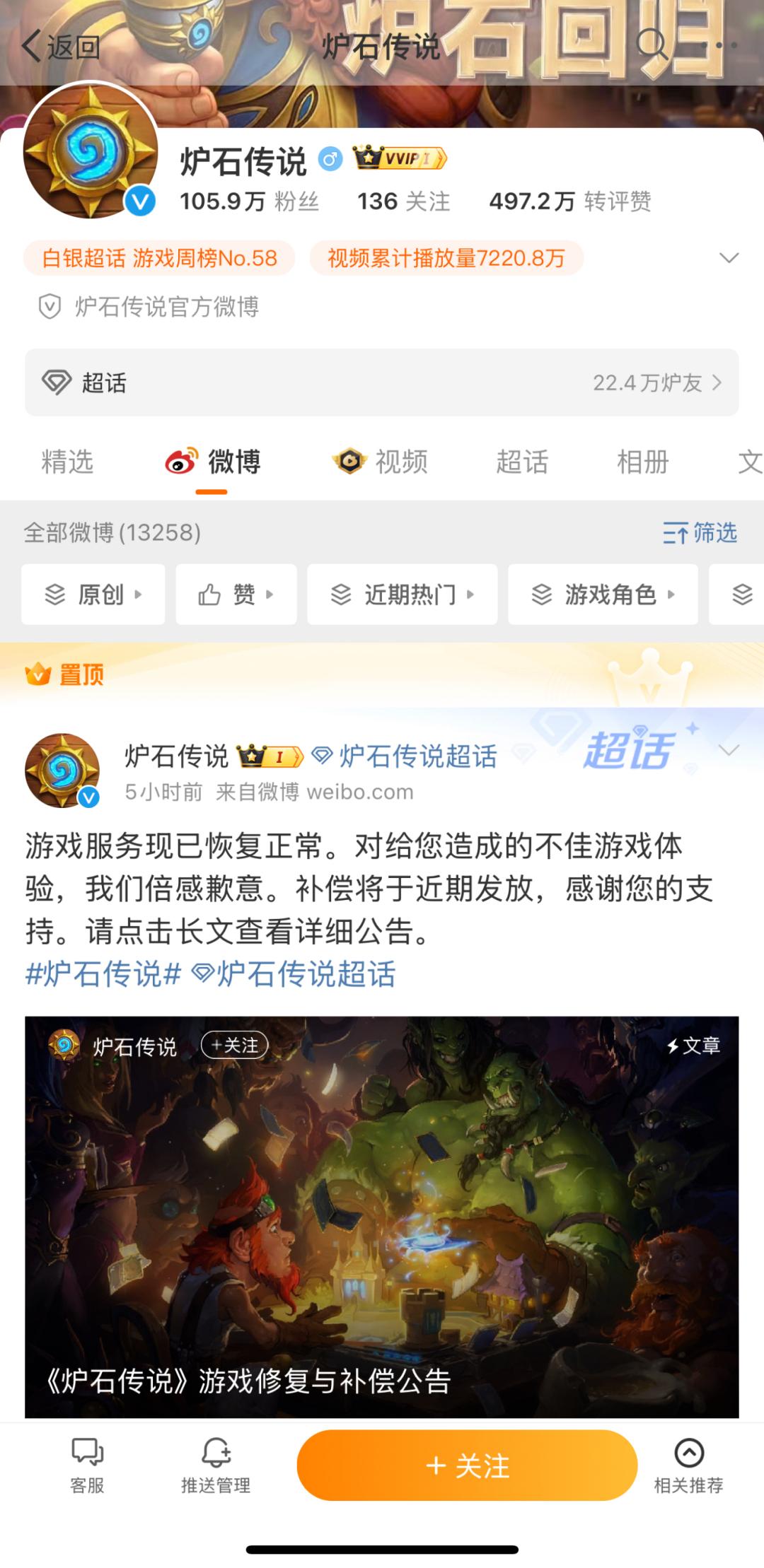 刚回归不久的暴雪《炉石传说》游戏国服再度发布公告。10月10日,炉石传说官方微博发布有关该游戏的修复与补偿公告。公告表示,在过去的一段时间内,《炉石传说》完成了大量的代码更新。目前异常的排队、匹配与断线问题已经得到解决。