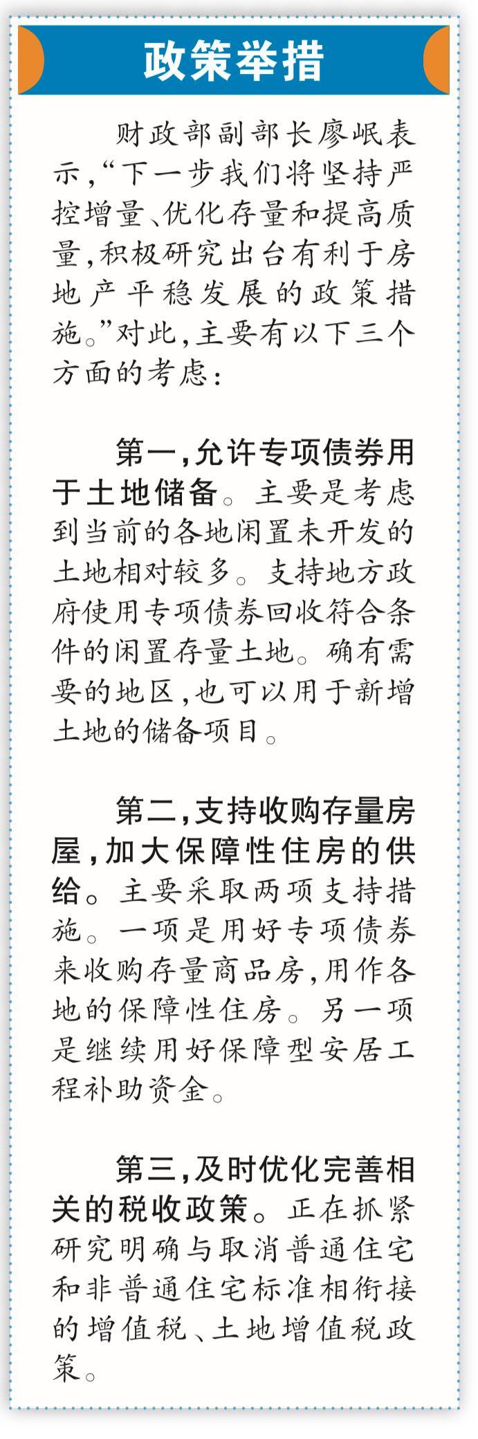 在10月12日举行的发布会上,财政部表示“将积极研究出台有利于房地产平稳发展的增量措施,支持收购存量房”。对此,主要采取两项措施:一项是用好专项债券来收购存量商品房,用作各地的保障住房。另一项是继续用好保障性安居工程补助资金。