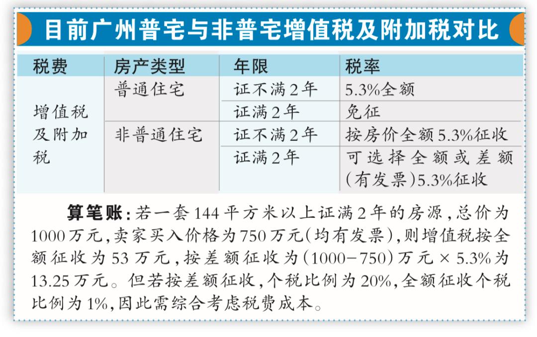 “按比例来说,在广州5.3%的非普通住宅增值税可以说是二手交易中最为可观的一笔税费。”一位中介业内人士告诉记者,目前广州普通住宅转手满两年即可免征增值税,而非普通住宅则不享受减免优惠,两年内全额征、满两年后在提供发票的情况下可选择差额征收。