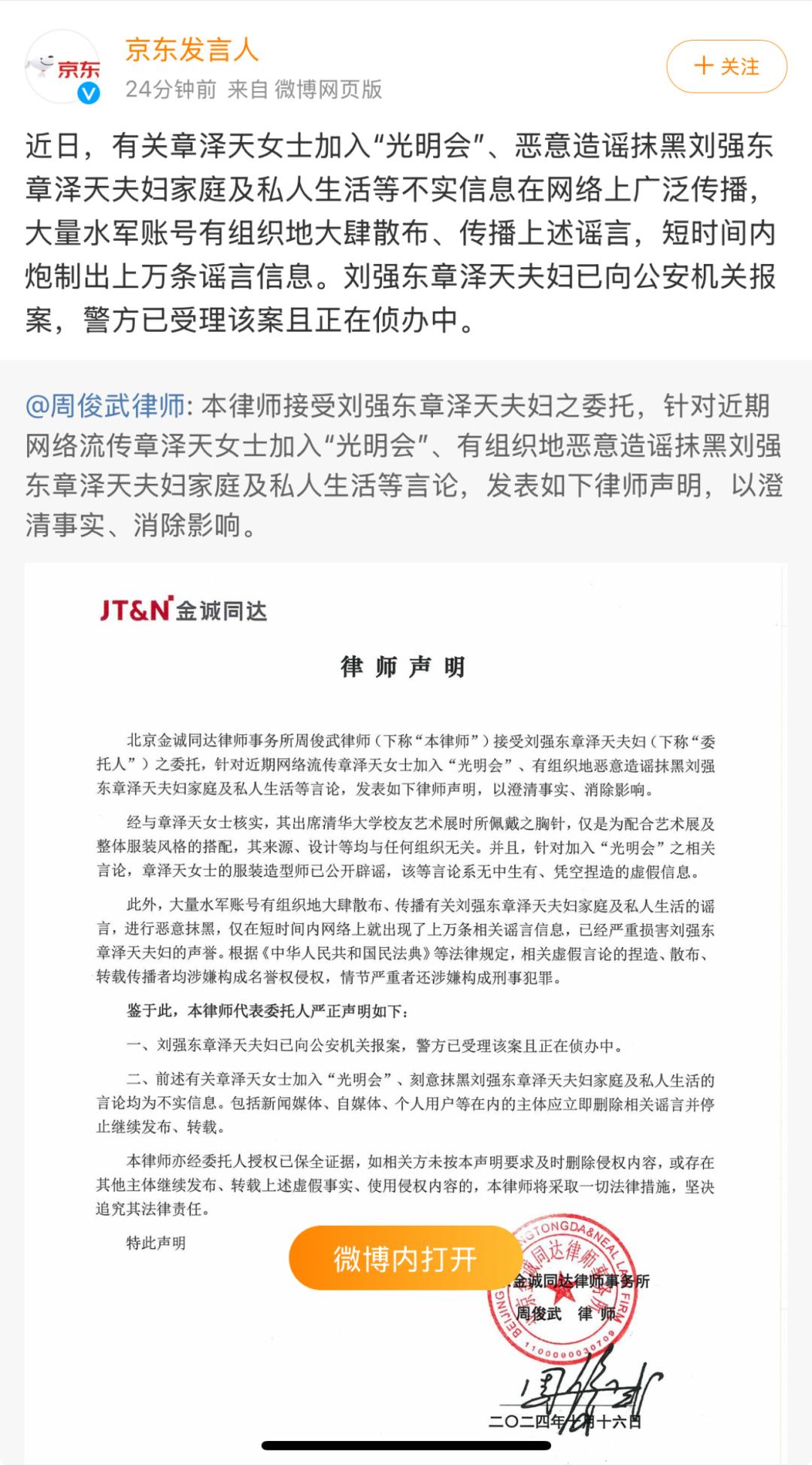 10月16日,认证为京东集团官方权威信息发布的“京东发言人”在微博发文表示,近日,有关章泽天女士加入“光明会”、恶意造谣抹黑刘强东章泽天夫妇家庭及私人生活等不实信息在网络上广泛传播,大量水军账号有组织地大肆散布、传播上述谣言,短时间内炮制出上万条谣言信息。刘强东章泽天夫妇已向公安机关报案,警方已受理该案且正在侦办中。