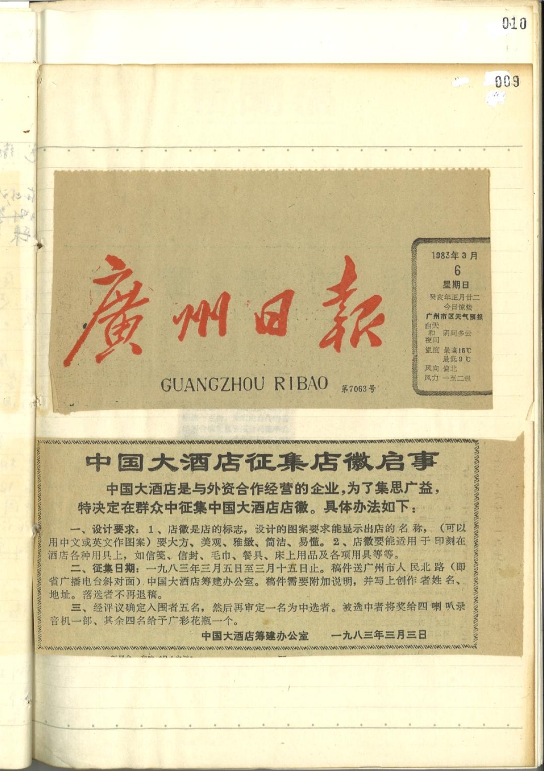 一则刊登于1983年ko3月6日《广州日报》上的《中国大酒店征集店徽启事》吸引了本报记者的注意。这是中国大酒店当年为集思广益,向群众公开征集酒店店徽而刊登的重要启事,此次也是首次展出。当年,这则启事在《广州日报》刊登之后大获关注,投稿如雪片般涌向酒店。后来,酒店在7026份来稿中采纳了林新穗先生的“红灯笼”设计构思,最终一个以最具中国传统特色的红灯笼为基础、象征喜庆吉利,以“中”字为中心的标志成为这家酒店的店徽。而如此大规模地发动群众参与设计一家酒店的店徽,这不仅在广州的酒店发展历史中成为重要的里程碑事件,体现了开放包容的城市基因和“广式服务”以客为本的精髓。