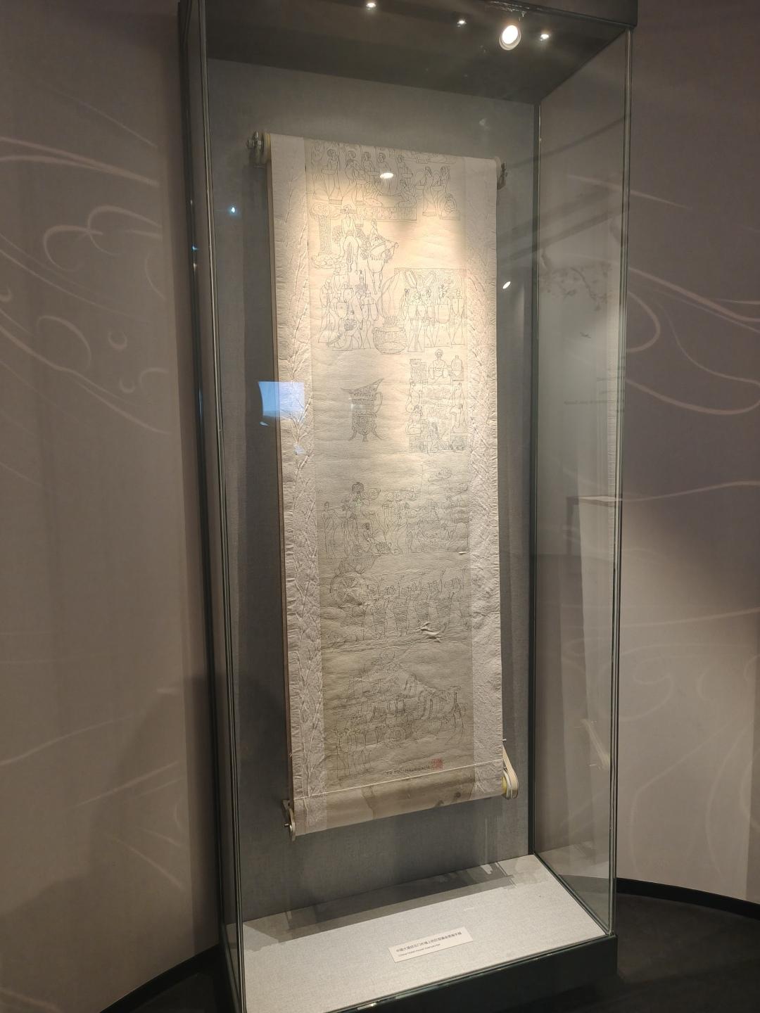 立式玻璃展示柜里,缓慢滚动的卷轴展示了著名雕塑家潘鹤创作的珍贵手稿,手稿上是中国大酒店外墙鎏金壁画的原图全貌。卷轴滚动间,历史感扑面而来。对于广州市民以及曾经入住过中国大酒店的宾客来说,中国大酒店外墙上的巨型鎏金壁画一直让人印象深刻,而壁画的手稿此次也在历史文化空间内首次公开展出,该手稿以“贸易通四海,歌舞庆升平”为主题,刻画了109个形态各异、栩栩如生的人物造型,再现了海上丝绸之路的盛景。记者看到,手稿正对的电视里还不断播放着详细记录鎏金壁画修复工程的宣传片,此次修复工程从去年起启动,使用4800克金箔贴就了9公里长的金线,让这幅壁画辉煌再现,继续见证千年商都的气脉。