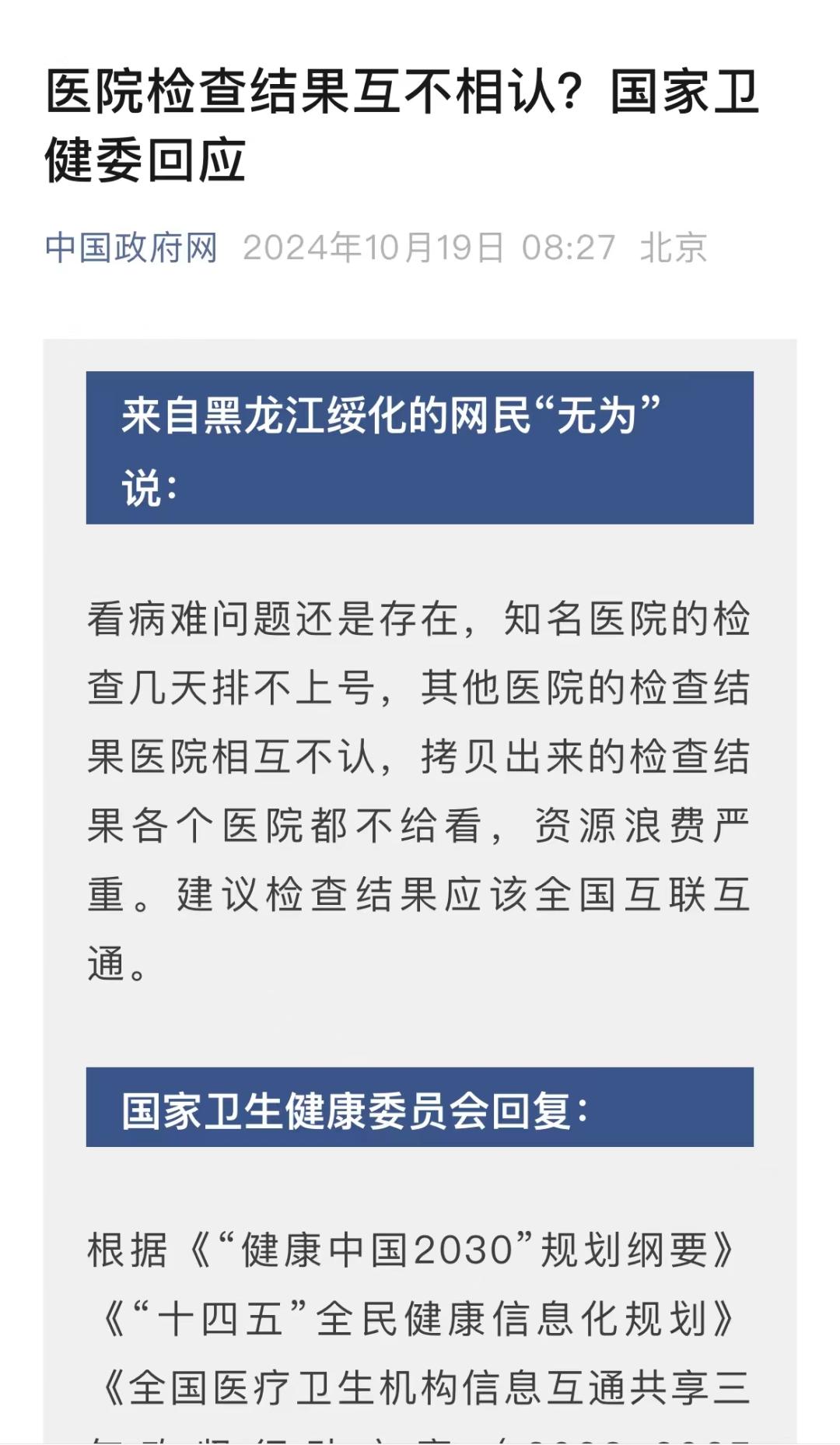 据悉,来自黑龙江绥化的一位网友表示:看病难问题还是存在,知名医院的检查几天排不上号,其他医院的检查结果医院相互不认,拷贝出来的检查结果各个医院都不给看,资源浪费严重。建议检查结果应该全国互联互通。对此,国家卫生健康委员会进行了回应。