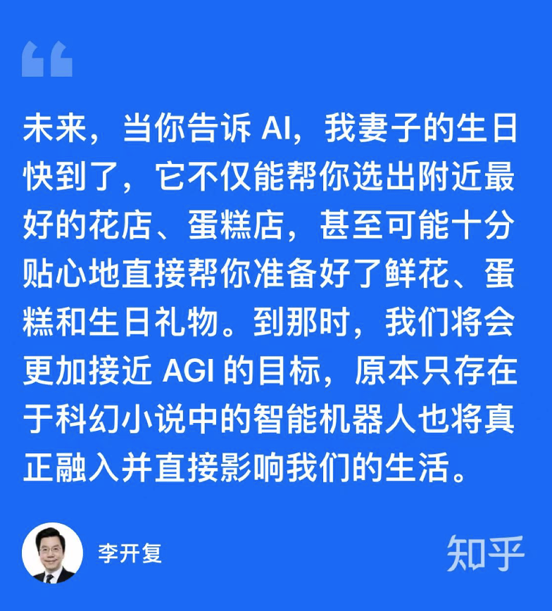 李开复坚信在未来的两年内,会诞生很多基于大模型之上令人惊艳的应用。人工智能会更懂人类的需求并做出执行动作,改变未来生活图景的时代也将到来,“原来只存在于科幻小说中的智能机器人将融入并直接影响我们的生活”。
