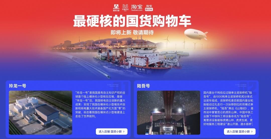 淘天表示,去年天猫双11,有不少网友是通过网页版“围观”上架到“国资小新”淘宝店的“大国重器”链接。今年天猫双11期间,淘宝网还将上线“最硬核的国货购物车”会场,搜索“大国重器”即可抵达。会场将向广大消费者全方位展现所有上架淘宝的大国重器,展示代表中国制造最高水平的尖端科技、制造实力。